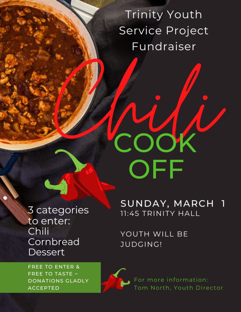 We’re expecting more attendees at this Sunday’s Chili Cookoff than last December when the boiler made it too “chili” to attend (pictured right)! We will need YOUTH HANDS ON DECK this Sunday, March 1 after church to judge the Chili Cookoff being held after the service. Chili, sides and desserts are the categories being judged. A free will offering will be accepted and designated to one of 3 areas: Good Samaritan Fund / Pastor’s Discretionary Fund / Youth.