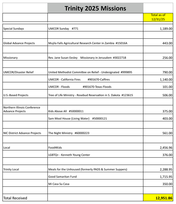 The Good Samaritan Fund is one way we live out Christ’s call to care for our neighbors. It provides confidential, short-term assistance for those facing urgent financial needs, allowing our church to respond with compassion, respect, and practical support when it’s needed most. Look for the Mission envelopes in the pews on Sunday to give or go online to www.trinitymp.org/give.  Raise Right Gift Card order forms in the narthex are a great way to order Food or Gas Cards for this cause. See Lloyd Unger for further details on card ordering, or Wendi Thourson for information on the fund itself.
