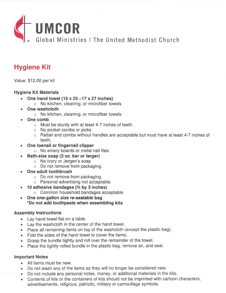 Trinity is collecting items and packing Hygene Kits for UMCOR for the UWFaith upcoming Winter